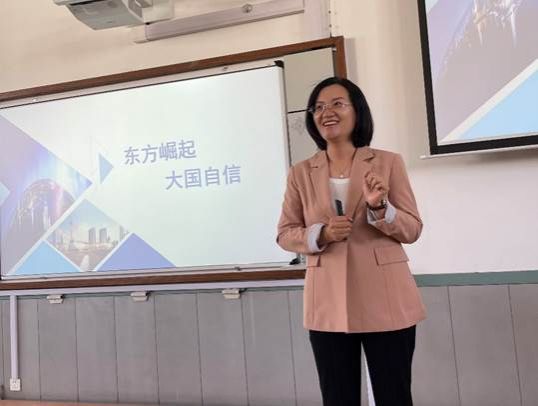 冯颂妹老师以“东方崛起 大国自信”为主题,以近期的国际热点事件为切入点,从中国经济实力、经济发展新格局和新时代经济全球化的引领者三方面展开叙述,并对中西方的经济模式进行了对比,引发了同学们的深入思考和热烈讨论。冯老师讲到中国就如同迷雾中的一束光,在坚定不移推进高水平对外开放的同时,继续与亚太携手、与世界同行,为动荡的世界提供了更多的稳定性和确定性,为推动构建人类命运共同体、推动形成开放、多元、稳定的世界经济秩序贡献中国力量和中国智慧。最后,冯老师以《觉醒年代》中的一段视频作为结尾,鼓励青年一代勇担重任,抓住机遇,努力奋斗,去创造属于自己的精彩人生!