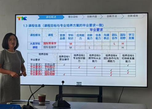 为了提升专业课程的建设水平与课堂教学质量,本学期学院周二下午例会后,开展专业课程说课活动。本学期第一周的说课活动,由国际经济与贸易教研室的冯颂妹进行《国际贸易学》课程的说课,学院领导、全体教师参加。